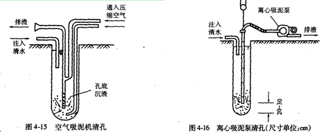 ●清孔的方法:有抽浆法、换浆法、掏渣法、喷射清孔法以及用砂浆置换钻渣清孔法等。其中抽浆法清孔较为彻底,适用于各种钻孔方法的灌注桩。对孔壁易坍塌的钻孔,清孔时操作要细心,防止塌孔。