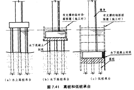 2.当承台位置位于水中时,一般先设围堰(钢板桩围堰或吊箱围堰)将群桩围在堰内,然后在堰内河底灌注水下混凝土封底,凝结后,将水抽干,使各桩处于干处,再安装承台模板,在干处灌筑承台混凝土。