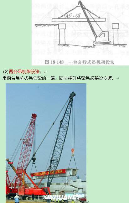 (1)一台吊机架设法:吊装时,一般将吊机置于待吊装的桥孔中间,如果起吊能力足够也可以将吊机置于台后或者已经吊装完成的桥孔上。吊装应注意起吊绳与梁面的夹角不能太小,一般以450~600为宜,否则,应使用扁担梁。