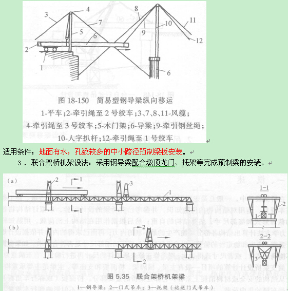 (此法适合于架设30m跨径的多孔桥梁,但该法作业较复杂,需要熟练的操作工人,而且架梁前的准备工作和架梁后的拆除工作比较费时,因此,此法用于孔数多、桥较长的桥梁比较经济)