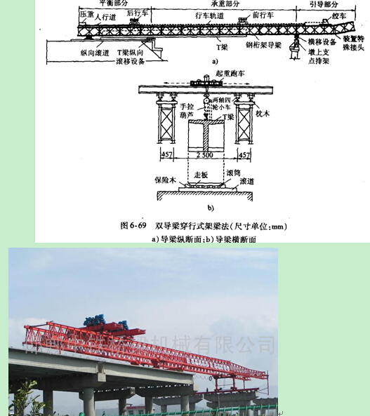 (适用于墩高、水深的情况下架设多孔中小型跨径的装配式梁桥,但不需要蝴蝶极,而配备双组导梁,故架设跨径可较大,吊装的预制梁可较重)