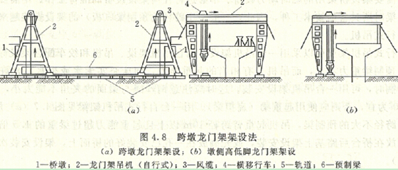 5 .跨墩龙门架架设法:预制梁由轨道平车或者平板拖车运至桥孔一侧,用两台同步运行的跨墩龙门吊将梁吊起再横移到设计位置落梁就位。