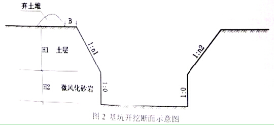 2.结合背景资料,说明图2中B的大小的要求,图2中对微风化砂岩开挖坡度设为1:0是否正确?说明理由。确定上层土层开挖坡度时应主要考虑哪些因素?