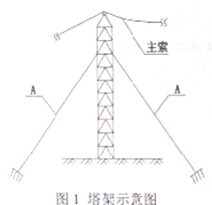 缆索吊装系统主要由塔架、主索(承重索)、起吊索、牵引索、扣索、工作索、天车(滑轮索)、索鞍、锚碇等组成。塔架高度85m,采用钢制万能杆件联接组拼,塔架示意图如图1所示。
