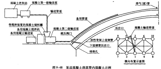 管内混凝土浇筑可采用人工浇筑和泵送顶升压注两种方法,一般应采用泵送顶升压注施工,由两拱脚至拱顶对称均衡地一次压注完成。由于分段浇筑对密封的钢管来讲较为困难,且由此而产生的若干混凝土接缝对钢管混凝土拱肋质量不利。所以,一般采用自拱脚一次对称浇(压)筑至拱顶的方案。