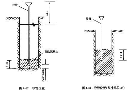 5.下导管时,其底口距孔底的距离控制在25~40cm(注意导管口不能埋人沉淀的回淤泥渣中)之间,同时要能保证首批混凝土灌注后能埋住导管至少1.Om。在随后的灌注过程中,导管的埋置深度一般控制在2.0~6.Om的范围内。