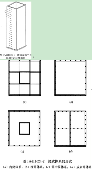 在高层建筑中,特别是超高层建筑中,水平荷载愈来愈大,起着控制作用。简体结构便是抵抗水平荷载最有效的结构体系。它的受力特点是,整个建筑犹如一个固定于基础上的封闭空心筒式悬臂梁来抵抗水平力,见图1A411024-1。简体结构可分为框架-核心筒结构、筒中筒结构以及多筒结构等,见图1A411024-2。框筒为密排柱和窗下裙梁组成,亦可视为开窗洞的筒体。内筒一般由电梯间、楼梯间组成。内筒与外筒由楼盖连接成整体,共同抵抗水平荷载及竖向荷载。这种结构体系适用于30~50层的房屋。多筒结构是将多个筒组合在一起,使结构具有更大的抵抗水平荷载的能力。美国芝加哥西尔斯大楼就是9个筒结合在一起的多筒结构。该建筑总高为442m,为钢结构。