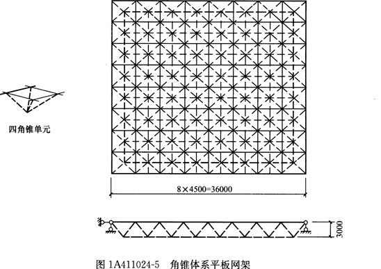 平板网架可分为交叉桁架体系和角锥体系两类。角锥体系受力更为合理,刚度更大,见图1A411024-5。