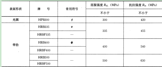 热轧光圆钢筋强度较低,与混凝土的粘结强度也较低,主要用作板的受力钢筋、箍筋以及构造钢筋。热轧带肋钢筋与混凝土之间的握裹力大,共同工作性能较好,其中的HRB335和HRB400级钢筋是钢筋混凝土用的主要受力钢筋o HRB400又常称新Ⅲ级钢,是我国规范提倡使用的钢筋品种。
