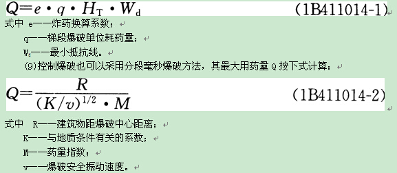 (8)爆破施工要严格控制飞石距离,采取切实可行的措施,确保人员和建筑物的安全,如采用毫秒微差爆破技术,将一响最大药量控制为最深单孔药量,当最深梯段为HT时,单孔装药量Q按下式计算: