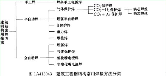 (1)建筑工程中钢结构常用的焊接方法:按焊接的自动化程度一般分为手工焊接、半自动焊接和自动化焊接三种,具体如图1A413043所示。