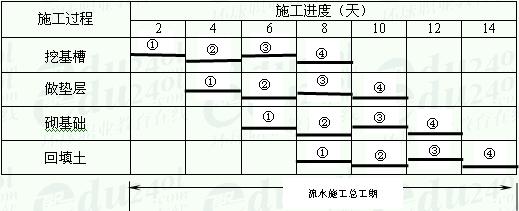 某基础工程流水施工的横道图表示法如图4.4.1所示。图中的横坐标表示流水施工的持续时间;纵坐标表示施工过程的名称或编号。n条带有编号的水平线段表示n个施工过程或专业工作队的施工进度安排,其编号①②……表示不同的施工段。