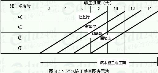 流水施工的表达方式除网络图外,主要有横道图和垂直图两种。