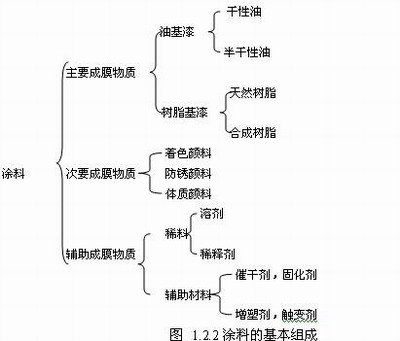 (1) 涂料的基本组成。涂料的品种虽然很多,但就其组成而言,大体上可分为三部分,即主要成膜物质、次要成膜物质和辅助成膜物质。