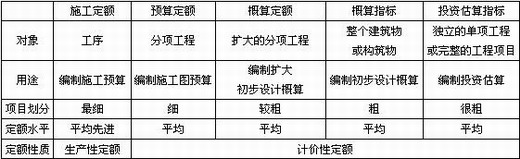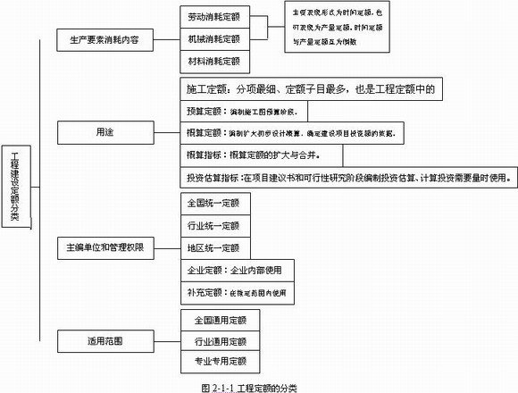 2)按定额的用途分类的五种定额,掌握各种定额间的相互联系。参见表2-1-1。