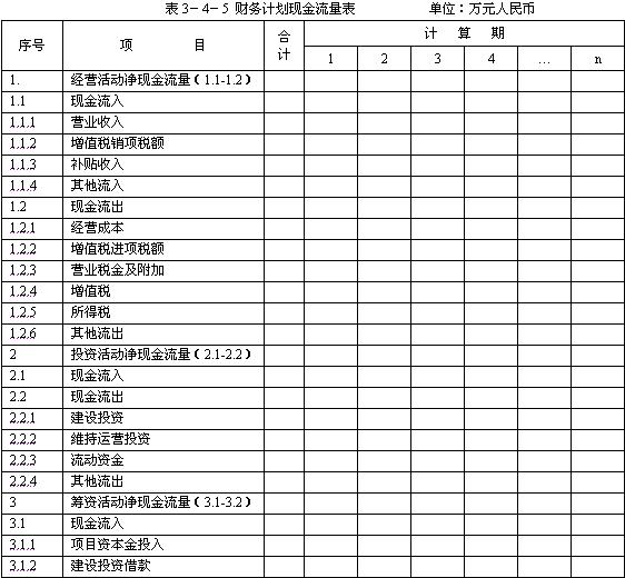 财务计划现金流量表示国际上通用的财务报表,用于反映计算期内各年的投资活动、融资活动和经营活动所产生的现金流入、现金流出和净现金流量,分析项目是否有足够的净现金流量维持正常运营,是表示财务状况的重要财务报表。为此,财务生存能力分析亦可称为资金平衡分析。财务计划现金流量表见表3-4-5.