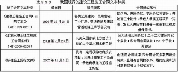 目前,在工程建设中比较典型的施工合同文本主要有:建设工程施工合同示范文本、水利水电土建工程施工合同条件以及《标准施工招标文件》的合同条款。主要内容见表5-3-3。