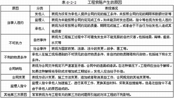 将工程索赔按照产生的原因进行划分,划分情况如表6-2-2所示: