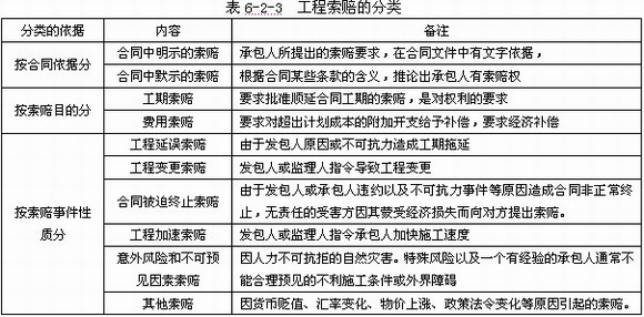 工程索赔按照不同的标准进行划分,可分为多种情况,表为将工程索赔按照合同依据、索赔目的及索赔事件的性质进行分类,每种索赔类型包括的具体内容见表6-2-3。