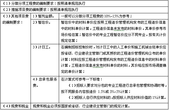招标控制价的编制内容包括分部分项工程费、措施项目费、其他项目费、规费和税金,各个部分有不同的计价要求: