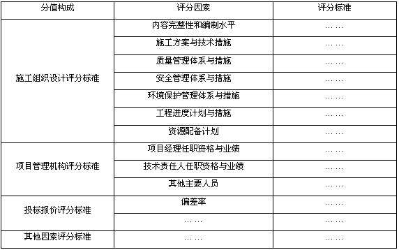 1)详细评审中的分值构成与评分标准。综合评估法下评标分值构成分为四个方面,即施工组织设计;项目管理机构;投标报价;其他评分因素。总计分值为100分。各方面所占比例和具体分值由招标人自行确定,并在招标文件中明确载明。上述的四个方面标准具体评分因素如表 所示: