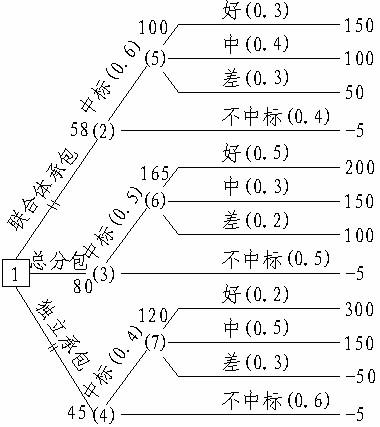 决策树法是确定投标报价策略时常采用的一种定量的概率分析方法。概率分析是在对确定因素概率大致估计的情况下,研究和计算各种经济效益指标的期望值及其风险程度的分析方法。一般情况下,常用决策树来确定方案的各种状态的收益及概率。