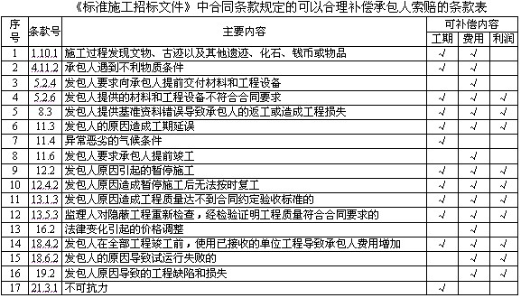 在不同的索赔事件中可以索赔的费用是不同的。如在FIDIC合同条件中,不同的索赔事件导致的索赔内容不同,大致有以下区别,见表 。