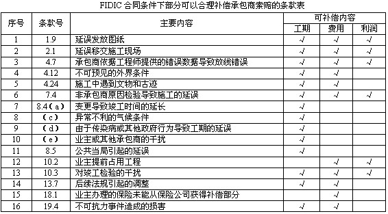 下表 中列示了FIDIC合同条件下部分可以合理补偿承包商的条款。