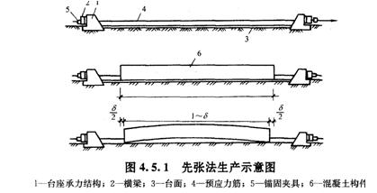 先张法是在浇筑混凝土构件前张拉预应力钢筋,并将张拉的预应力钢筋临时固定在台座或钢模上,然后再浇筑混凝土,待混凝土达到一定强度(一般不低于设计强度等级的75%),保证预应力筋与混凝土有足够的粘结力时,放松预应力筋,借助于混凝土与预应力筋的粘结,使混凝土产生预压应力,见图4.5.1.先张法多用于预制构件厂生产定型的中小型构件,也常用于生产预应力桥跨结构等。