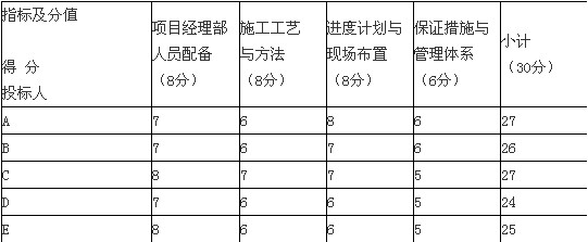 (1)技术标为30分,其中:项目经理部人员配备8分、施工工艺与方法8分、进度计划与现场布置8分、保证措施与管理体系6分。各投标人技术标得分见表3-1.