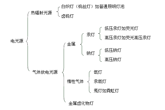 电光源按发光原理可以分热辐射光源和气体放电光源两大类。如下所示: