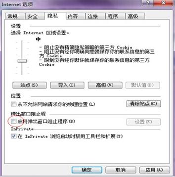 IE浏览器菜单栏――》工具选项下“Internet选项”――》隐私选项卡中将倒数第二个复选框“启用弹出窗口阻止程序”取消勾选,最后点击【确定】。效果如下图:
