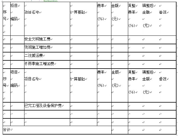 注:1.“计算基础”中安全文明施工费可为“定额基价”、“定额人工费”或“定额人工费+定额机械费”,其他项目可为“定额人工费”或“定额人工费+定额机械费”。