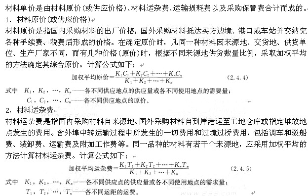 材料单价=[(供应价格+运杂费)×(1+运输损耗率(%))]×[1+采购及保管费率(%)](2.4.9)