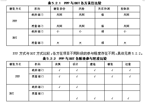 PPP方式与BOT方式在各方责任方面有着较为明显的不同,总的来说,BOT项目中政府与民营企业缺乏恰当的协调机制,导致双方自身目标不同,出现利益冲突,而PPP融资方式中政府与民营部门的关系更加紧密,具体比较见表5.2.1。
