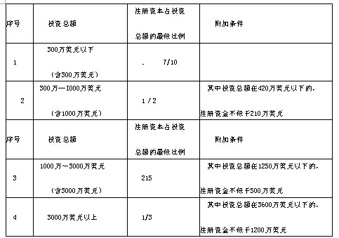 按照有关要求,外商投资企业的注册资本应与生产经营规模相适应,其注册资本占投资总额的最低比例见表5.1.2。