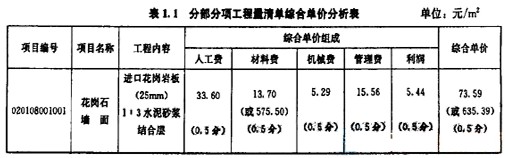 2.编制花岗石墙面工程的工程量清单综合单价分析表,列式计算并把计算结果填入答题纸表1.1中。