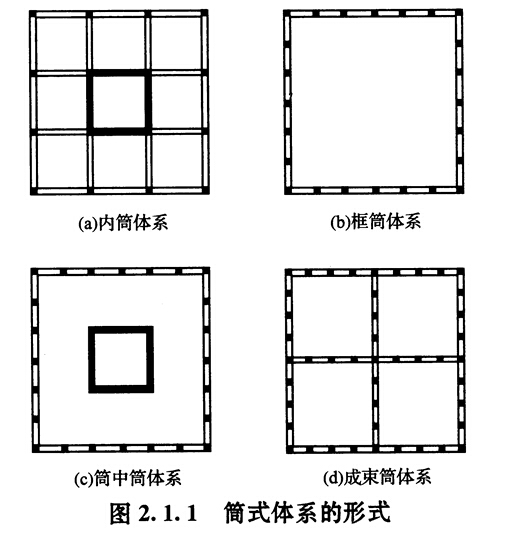 (5)筒体结构体系。在高层建筑中,特别是超高层建筑中,水平荷载愈来愈大,起着控制作用,简体结构是抵抗水平荷载最有效的结构体系。它的受力特点是,整个建筑犹如一个固定于基础上的封闭空心的筒式悬臂梁来抵抗水平力。筒体结构可分为框架一核心筒结构、筒中筒和多筒结构等,见图2.1.10框筒结构一般在中央布置剪力墙薄壁筒,承受大部分水平力,周边布置大柱距的稀柱框架,其受力特点类似于框架一剪力墙结构,也有把多个筒体布置在结构的端部,中部为框架的框筒结构。筒中筒结构的内筒一般由电梯间、楼梯间组成。内筒与外筒由楼盖连接成整体,共同抵抗水平荷载及竖向荷载。这种结构体系适用于30 ---50层的房屋。多筒结构是将多个筒组合在一起,使结构具有更大的抵抗水平荷载的能力。