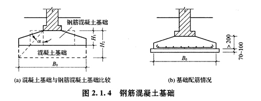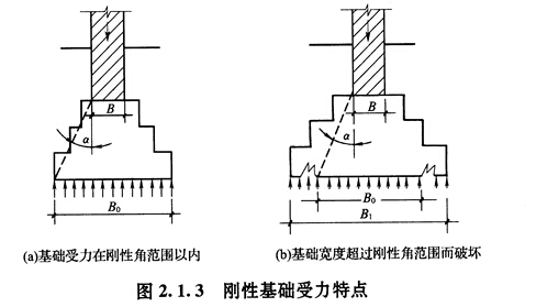 1)刚性基础。刚性基础所用的材料如砖、石、混凝土等,抗压强度较高,但抗拉及抗剪强度偏低。用此类材料建造的基础,应保证其基底只受压,不受拉。由于受地耐力的影响,基底应比基顶墙(柱)宽些。根据材料受力的特点,不同材料构成的基础,其传递压力的角度也不相同。刚性基础中压力分角口称为刚性角.o在设计中,应尽力使基础大放脚与基础材料的刚性角相一致,以确保基础底面不产生拉应力,最大限度地节约基础材料。受刚性角限制的基础称为刚性基础,构造上通过限制刚性基础宽高比来满足刚性角的要求,如图2.1.30
