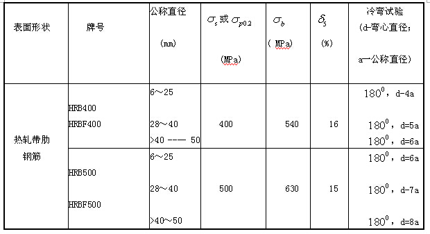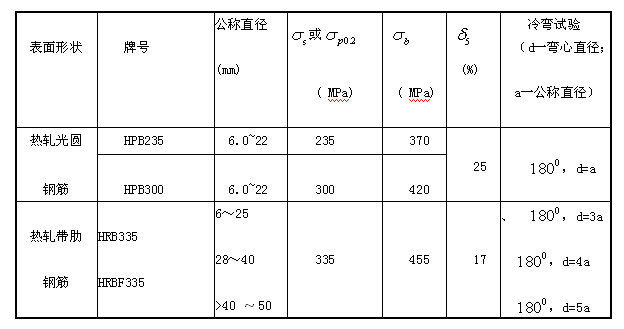 根据现行国家标准《钢筋混凝土用钢 第1部分:热轧光圆钢筋》GB 1499.1和《钢筋混凝土用钢 第2部分:热轧带肋钢筋》GB 1499.2的相关规定,热轧光圆钢筋分 HPB235.HPB300两种牌号,普通热轧钢筋分HRB335、HRB400.HRB500三种牌号,细晶粒热轧钢筋分HRBF335、HRBF400、HRBF500三种牌号。热轧钢筋的技术要求见表3.1.1,表中所列的强度值和伸长率均为要求的最小值。