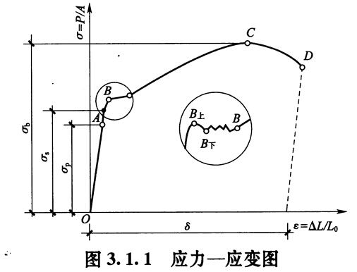 (全称抗拉极限强度)和伸长率。低碳钢(软钢)受拉的应力一应变图能够较好地解释这 些重要的技术指标,见图3.1.1。