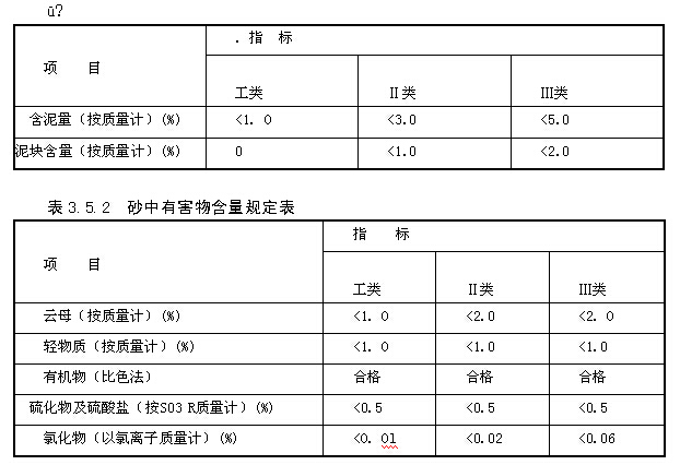 在《建筑用砂》GB7T 14684中,将砂按技术要求分为工类、Ⅱ类、Ⅲ类o I类宜用于强度等级大于C60的混凝土;Ⅱ类宜用于强度等级为C30~C60及有抗冻、抗渗或其他要求的混凝土;Ⅲ类宜用于强度等级小于C30的混凝土。