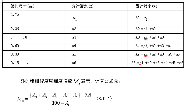 筛分析法是用一套孔径为4.75mm、2.36mm、1.18mm、0.60mm、0.30mm和 0.15mm的标准方孔筛的,按照筛孔的大小顺序,将用9.50mm方孔筛筛出的500g干砂, 由粗到过筛,称得各号筛上的筛余量。并且计算出各筛上的分计筛余百分率