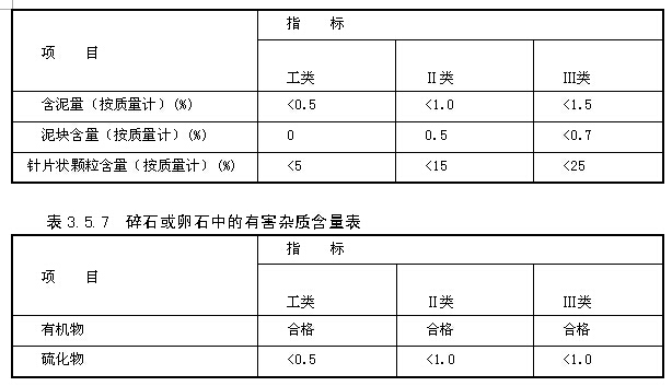 石子中含有黏土、淤泥、有机物、硫化物及硫酸盐和其他活性氧化硅等杂质。有的杂质影响粘结力,有的能和水泥产生化学作用而破坏混凝土结构。此外,针片状颗粒的含量也不宜过多。其控制含量见表3.5.6和表3.5.7。