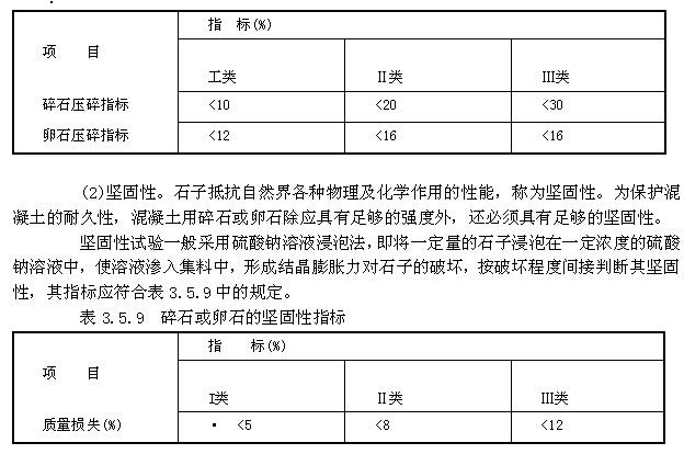 (1)强度。为能保证混凝土的强度和其他性能达到规定的要求,配制混凝土的碎石或卵石必须具有足够的强度。石子的强度用岩石立方体抗压强度和压碎指标表示。在选择采石场、对粗集料强度有严格要求或对质量有争议时,,宜用岩石抗压强度检验;对于经常性的生产质量控制则用压碎指标值检验较为方便。