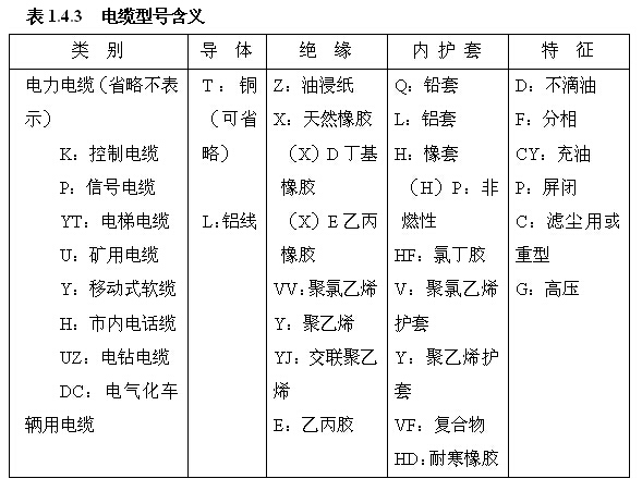 电缆型号的内容包含有:用途类别、绝缘材料、导体材料、铠装保护层等,电缆型号含义如表1.4.3所示,一般型号表示如下: