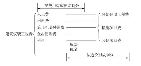 按造价形成划分建筑安装工程费用项目构成和计算;建筑安装工程费按照工程造价形成由分部分项工程费、措施项目费、其他项目费、规费和税金组成。