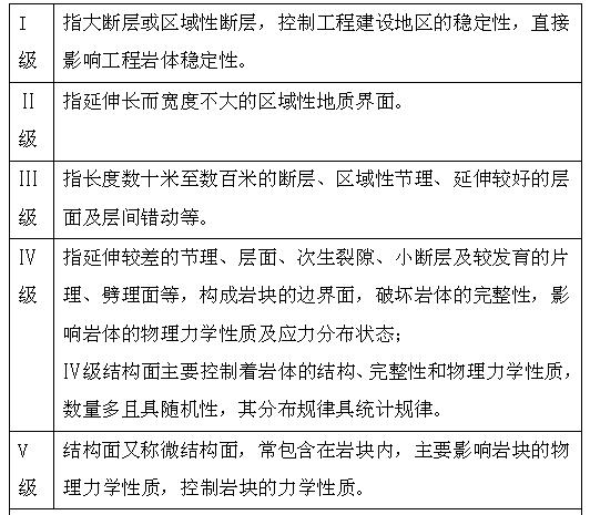 结构面与最大主应力间的关系控制着岩体的强度与破坏机理。结构面的规模是结构面影响工程建设的重要性质。结构面分为I~V级: