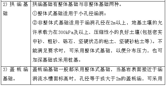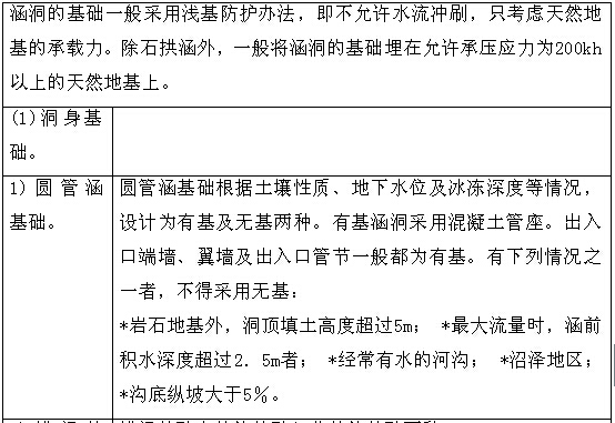 1)圆管涵基础。 有下列情况之一者,不得采用无基:岩石地基外,洞顶填土高度超过5m;最大流量时,涵前积水深度超过2.5m者;经常有水的河沟;沼泽地区;沟底纵坡大于5%。