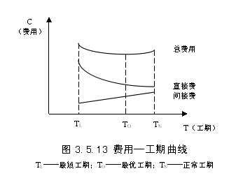 (1)工程费用与工期的关系。工程总费用由直接费和间接费组成。直接费会随着工期的缩短而增加。间接费包括企业经营管理的全部费用,它一般会随着工期的缩短而减少。在考虑工程总费用时,还应考虑工期变化带来的其他损益,包括效益增量和资金的时间价值等。工程费用与工期的关系如图3.5.13所示。